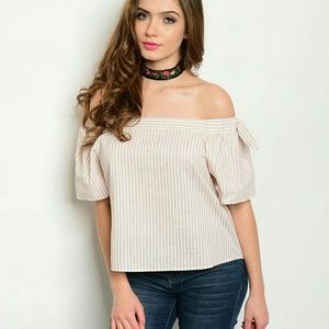 Ivory, coral and brown striped off the shoulder, poplin top, ties on each shoukder, 100% cotton. Measurements for a medium- B-36", W-38", L- 20"