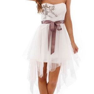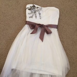 Strapless ivory dress with jewels and sequins on the bodice and a satin mocha sash (detachable). Lightly padded cups on the inside of the bodice.