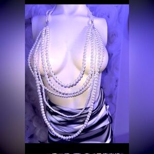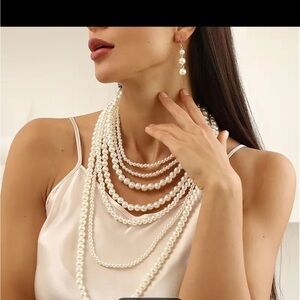 The multi-strand design adds depth and dimension, catching the light beautifully with every movement. The set also includes matching faux pearl earrings, completing the polished and coordinated look. Whether you're dressing up for a special occasion, adding a touch of classic charm to your work attire, or simply want to feel effortlessly chic, this necklace and earring set is a versatile addition to any jewelry collection.
