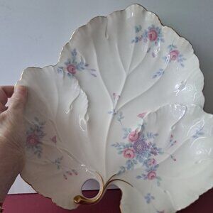 Plate is in perfect condition, no chips, cracks. The name of pattern is English Garden. Bone China. Height is 11" , width is 11 1/2". Gold trim around the rim of plate is in excellent condition. Could be used as serving dish or display.