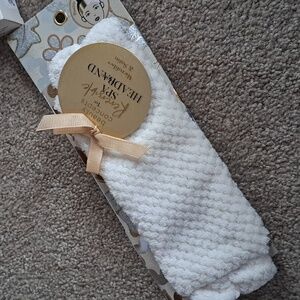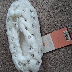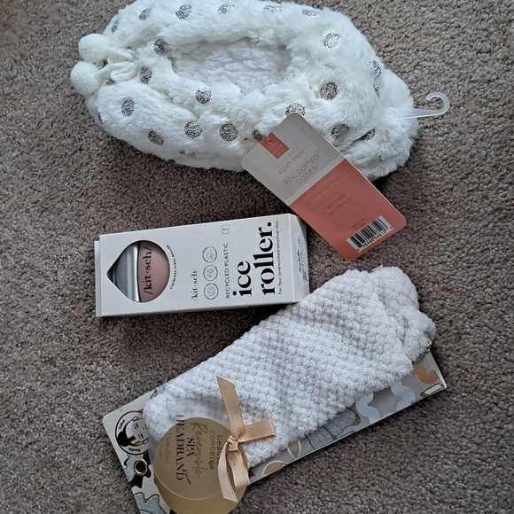 Includes: fluffy, foil dotted footies (size 8-10) recycled plastic ice roller reversible spa headband