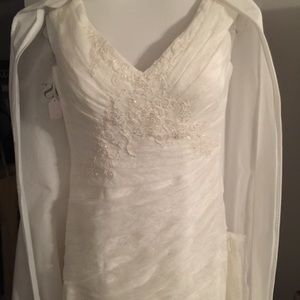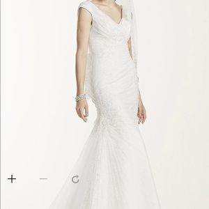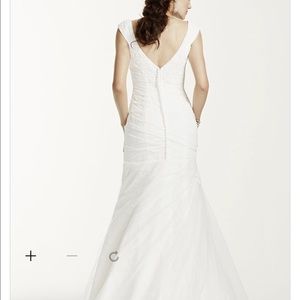 Price dropped!! Davids bridal lace and tulle beaded wedding gown. With straps, side roushing, and beaded details. Deep v back. Never worn. Bustle has been added. Paid $1000 for the dress and $350 to add the bustle. Asking $500 OBO. Its very figure flattering. Size 10, but I typically wear an 8. Size 36c bust.