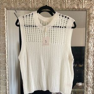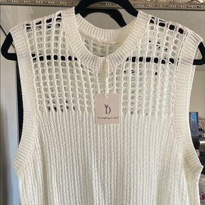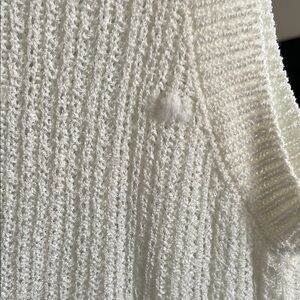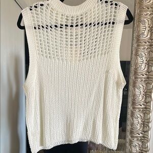 Elevate your style with this chic white sleeveless knit top. Perfect for layering or wearing on its own, it offers a versatile and elegant look. One size- fits small-large, fit should be relaxed. See last pic for minor flaw in knitting- you might be able to cut it or fix it. No rips or tears. Brand new with tags color is Ivory white