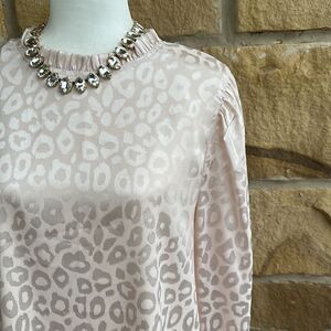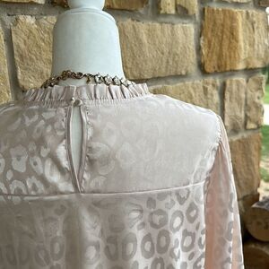 This beautiful blouse ships to you in perfect, never worn condition. No visible signs of wear, snags, or stains. Ivory on ivory, leopard print, high ruffle neck, women’s size large. Boutique brand Savanna Jane is true to size.