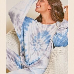 My favorite colors!! Ivory, Blue & Grey High Waist Spiral Tie Dye Sweatpants with pockets, elastic waist & banded ankles. The colors & spiral tie dye were a must here for me. I’m a sucker for tie dye obvi; blue & grey spiral tie dye & it’s all over. Lol
