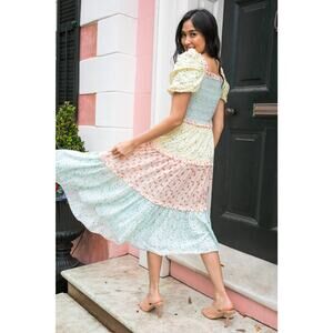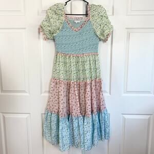 Ivy City Co Emily Patchwork Smocked Shirred Puff Sleeve Tiered Midi Dress Large