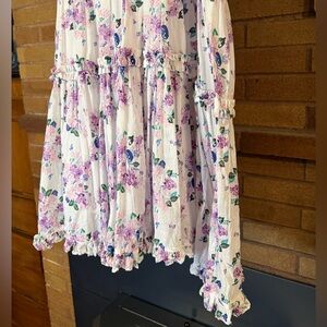 Charming floral dress with long sleeves. Features a purple and white pattern. Worn once.