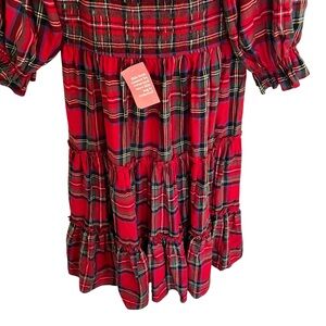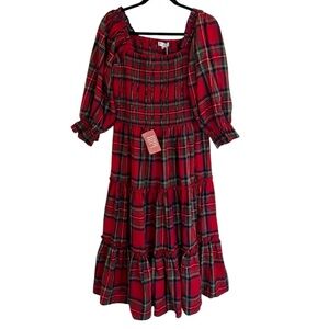 Ivy City Co Red Madeline Smocked Square Neck Midi Dress in Holiday Plaid NWT XL