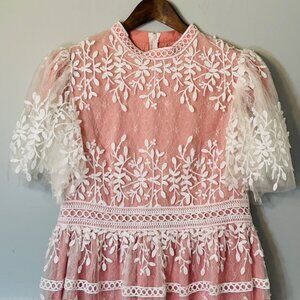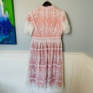 Ivy City White & Pink Lace Fit & FlareDress. Short Flutter Sleeves, High Neck Dress with Fitted Waist and A-Line Skirt, Sheer White Eyelet Style Floral Lace Overlay, Pink Lining. Midi Length Fit & Flare Party Dress.