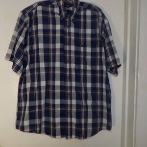 blue/cream / gray color ways with other minor undertones , short sleeves , button down collar , button down center front , single open breast pockets , 65% Polyester 35% Cotton , Sz L measurements are roughly 29" from shoulder to hem and about 25" pit to pit , Good used condition no issues shows minor washing wear , from the closet of a deceased smoker currently in a pet friendly non smoking home