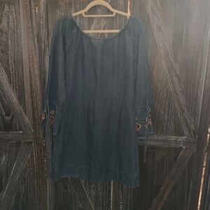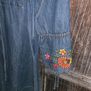Chic navy midi dress. Features vibrant floral embroidery. Perfect for any occasion.