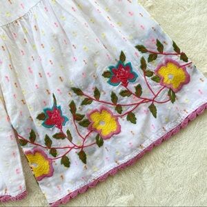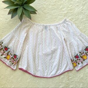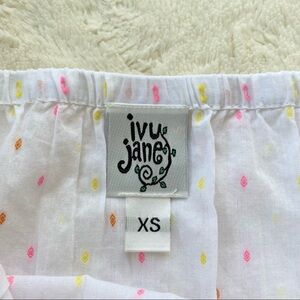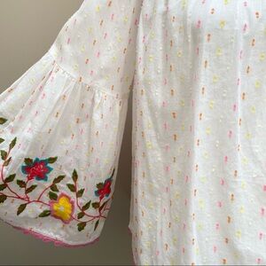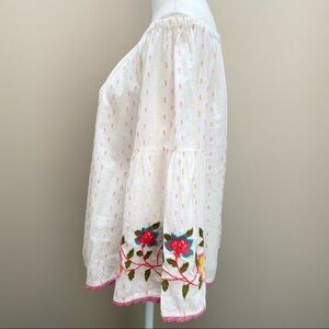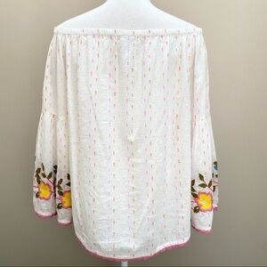 Ivy Jane Swiss dot embroidered off shoulder top XS in excellent condition,no flaws.I love the pink and yellow color combination and the embroidered flowers with scalloped crochet trim.oversized fit so could fit a small very comfortably-possibly a medium.please refer to photos for measurements and details