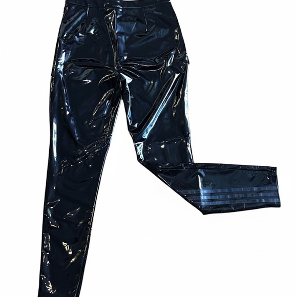 Sleek and stylish shiny black patent leather pants. Perfect for a bold fashion statement.