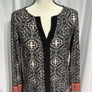 Ivy Ridge printed v-neck long sleeved shirt with cream and black on the majority of the shirt, and accents of maroon, orange, yellow. No fabric care tags or size tags, so please use measurements. Measurements taken while item is lying flat.