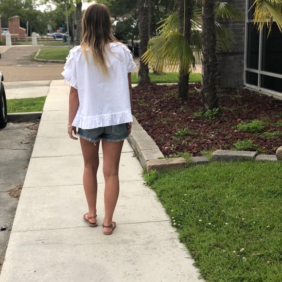 For a casual look, match this adorable ruffle top with your choice of light or dark denim.