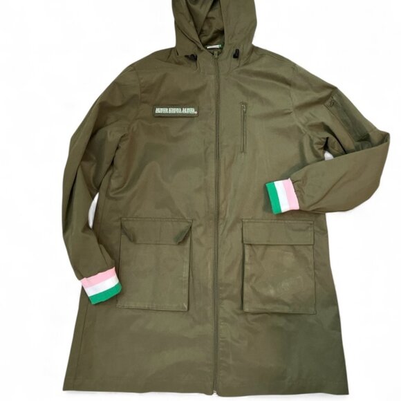 Ivy Storehouse Alpha Kappa Alpha sorority utility coat in olive green features sorority classic green, pink, white trim along zipper and sleeve cuffs, full zip, lined, 2 large flap pockets in front and zip pocket on sleeve. hooded and mid length. Coat comes with 2 Velcro badges (see pics) . Coat is in excellent condition, measures 21 in pit to pit, 24-inch sleeve length, 31-inch length from collar to hem.