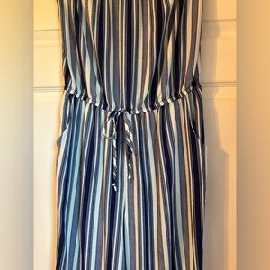 Like new, gently worn blue and white striped strapless jumpsuit from Ivy. The inseam is 28.5 and the full length from armpit down is about 48 inches. The jumpsuit has pockets and the waistline is somewhat adjustable.