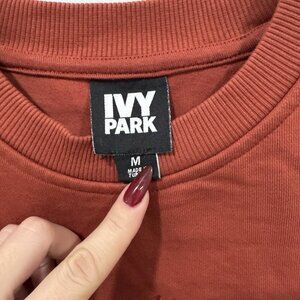 This Ivy Park sweatshirt is a stylish activewear piece in a dusty orange-red color. It features a crew neck, long sleeves, and a pullover closure for easy wear. The sweatshirt is designed with a split hem for added detail and a comfortable fit. With a size M for women's sizing, this pullover sweatshirt is a must-have for your activewear collection.