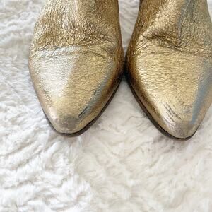 Slender silhouette, comfortable stacked heel, and pointed toe. Gored elastic panels. Pull-on style. Gold crackle texture. LWG Certified Italian leather. Handmade in Portugal.