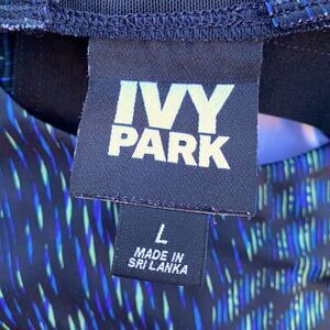 Ivy Park Black/Blue/Green Abstract & Geometrical Pattern Workout Tank. Racerback. Size Large. Excellent pre-owned condition! Really cute workout tank with a pop of royal blue and lime green with built in sports bra, no padding. Ships from a smoke and pet free home.