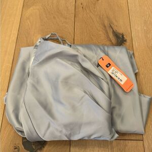 Designed to beguile with every step with a full, high/low skirt, this satin gown keeps things simple yet elegant with crossover bodice and dual V-necklines.