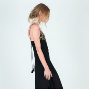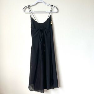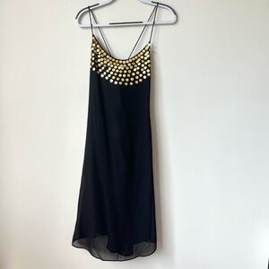 Elegant black midi dress with gold embellishments. Spaghetti straps. Perfect for evening wear.