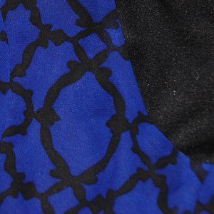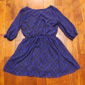 Blue, half sleeve, dress with black accent pattern. The dress has an elastic waistband and belt loops. Juniors sized.