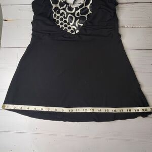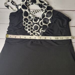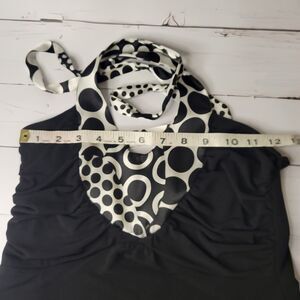 This Iz Byer California halter top is in excellent used condition. The black and white circle material is a satin type material with a long neck tie to tie in back. The upper back is elasticized for a comfortable fit. The care tag is cut out but it has been handwashed. No flaws, stains, damage. Please see photos for details and measurements.