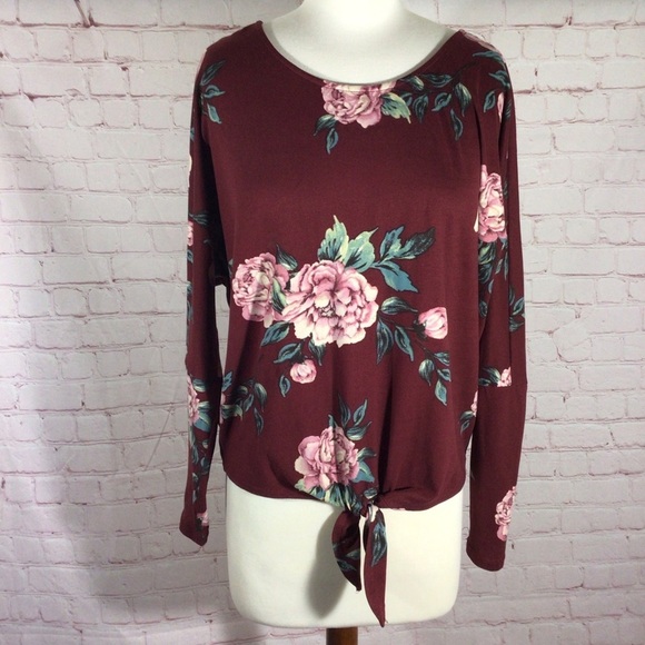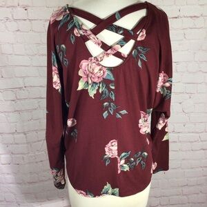 Iz Byer floral long sleeve top. Size XS. This top ties in the front and has a beautiful criss cross detail in the back. Made of a polyester/spandex blend so it does have some stretch to it. This top so super soft! Excellent condition. No rips, holes or stains. Smoke free home.