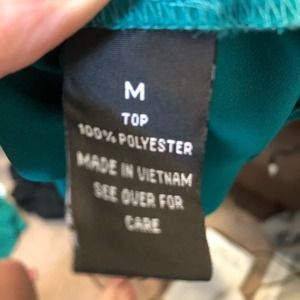 Iz Byer green v neck tunic blouse with black lined neckline. Chiffon material with lining underneath. Cuffed 3/4 length sleeve. Belt loops. Looks great with high boots or leggings! Size Medium