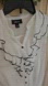 Chic white blouse with elegant black trim. Features ruffled front and cap sleeves. Perfect for stylish occasions.