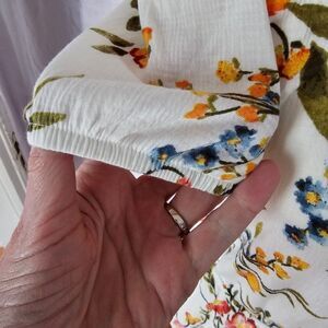 This elegant blouse from Iz Byer features a sophisticated tie front and a flattering peplum silhouette. Crafted in a soft white and cream palette, it offers a chic and versatile addition to your wardrobe. Perfect for both casual and formal occasions, this top combines style and comfort effortlessly. excellent condition. 16 inches pit to pit and 21 inches from shoulder to waist