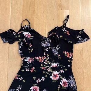 This stunning sundress by Iz Byer features a chic asymmetrical high-low hemline and a cold shoulder neckline, perfect for a wedding guest or cocktail event. The sleeveless design with flutter sleeves adds a touch of elegance, while the black and pink color palette ensures a sophisticated look. Has a high leg slit with built in shorts for security.