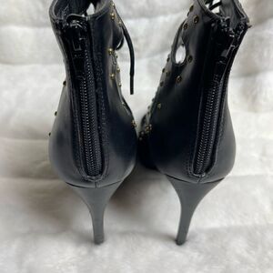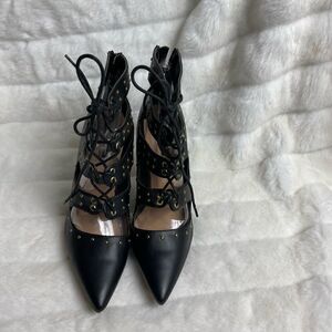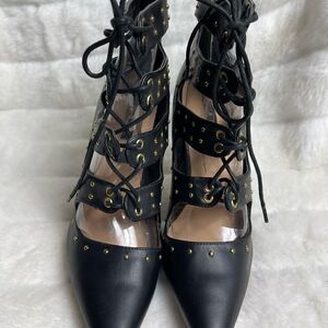 Izabella Rue Grette black studs lace up heels pointed toe with back zipper SZ10. Pre owned in good used condition small peelings on both heels see all pictures any questions please message.E7