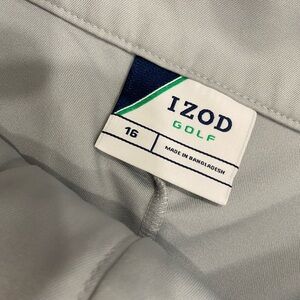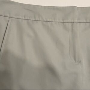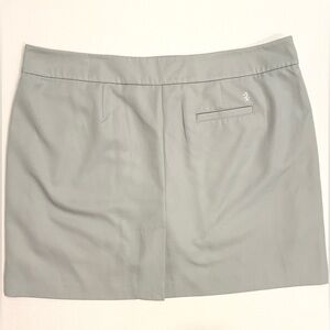 Stylish Izod golf skirt, 18” length. Fly front, side slash pockets with mesh lining. Light gray color. Perfect for golf or as a nicer substitute for shorts for any casual outings.