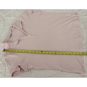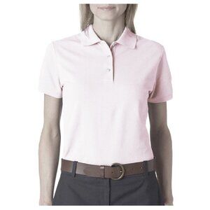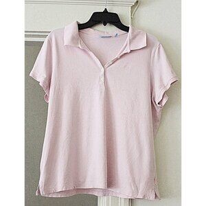 Izod Women's 5 Button Polo with IZ Logo in color Fresh Pink, size Medium. Fabric is stretch cotton jersey.