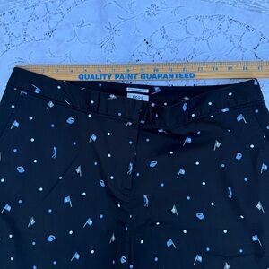 Izod ladies golf shorts in black with golf flags, golfer, visors and polka dots. Like new condition. Size 14