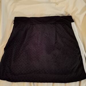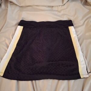 Izod woman's athletic textured black with yellow and white striped skorts with shorts underneath and slits on the sides. Size Medium. Waist side to side 15-1/2 inches with stretch. Length 16 inches.