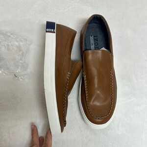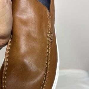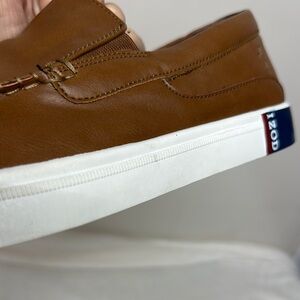 Experience the perfect blend of style and comfort with these Izod loafers, featuring a rich brown leather upper and a contrasting white rubber sole. The slip-on design with elastic goring ensures a snug fit, while the streamlined silhouette and subtle stitching add a touch of elegance to any outfit.