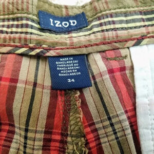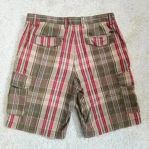 Izod men's cargo shorts, size 34, 11" inseam, 100% cotton, 2 front pockets, 2 leg pockets with hook & loop flap closure, 2 back pockets with hook & loop flap closure, flat front, tan and red plaid, soft and lightweight. See photos for complete condition and description. Smoke free environment.
