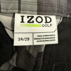 The Izod Golf Pants for men in size 34x29 are designed for performance on the golf course. Made from a blended fabric of polyester and spandex, these gray check pants offer stretch for ease of movement during swings. The flat front straight leg style and versatile gray color make them suitable for both activewear and casual occasions. Featuring a zip closure, slash pockets, and a breathable design, these lightweight pants are machine washable for easy care. Perfect for golf enthusiasts, these pants combine style with functionality for a comfortable and stylish look on the course.