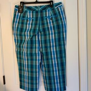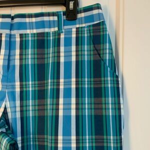 Stylish plaid golf pants in blue and green. Perfect for casual or golf outings.