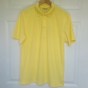 100% reprocessed polyester. Bright yellow Izon Golf collared short sleeve shirt. Excellent condition. Size Small. Please compare measurements to something similar to ensure fit.