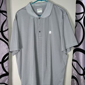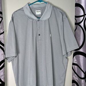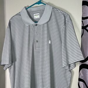 Izod, gray, striped golf polo, short sleeve, three button closure, logo on both the front and the back, size XXL made of 100% polyester