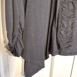 This Izod topper features a sleek open-front design in a sophisticated gray hue, perfect for layering. Crafted from a soft, lightweight knit, it offers a comfortable drape and a stylish shawl collar. The long sleeves and hip-length cut make it a versatile addition to any wardrobe.