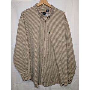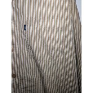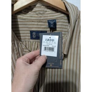Izod Jeans Mens Striped Button Down Shirt Size XXL Cotton Textured Tan Brown NWT. Shirt is new with tags but does have a small flaw. Please see up close photo.
