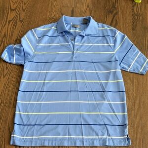 Classic Izod polo with light blue and white stripes. Comfortable and stylish for everyday wear.