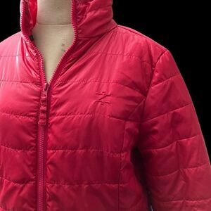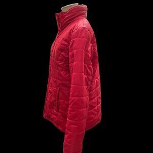 Gorgeous new, bright red, zip up the front jacket. It’s not one of those puffers that you’d choose in a blizzard. It is perfect for that overly ACed restaurant, maybe thrown over your shoulder as you leave class or the office.