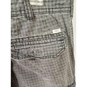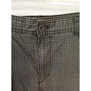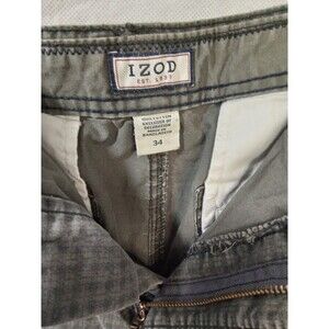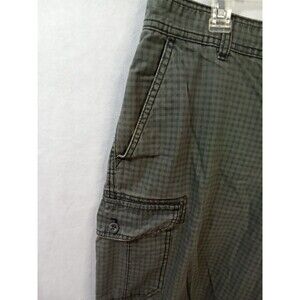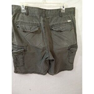 Izod mens size 34 plaid green black cargo shorts button and zip up made of 100% cotton and is machine washable. This is a pre-owned item in good used condition small wear spot on one of the back pockets no stains.