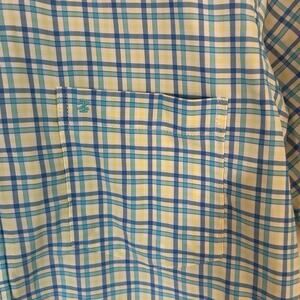 Features: Button-down collar, button front, chest pocket, stretch, moisture wicking, quick dry, blue/green/yellow